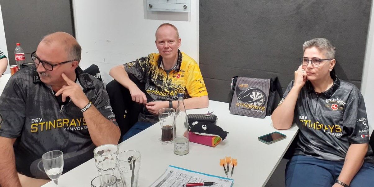 Insbesondere Barny und Rasty Man zeigten Kämpferquallität. Sascha vergab leider in seinem starken Start-Einzel zu viele Match-Darts auf Doppel und unterlag in einem spannenden Decider. Marc hingegen bewies Nervenstärke und schnappte sich sein Einzel mit dem entscheidenden Doppel-Check im Decider.