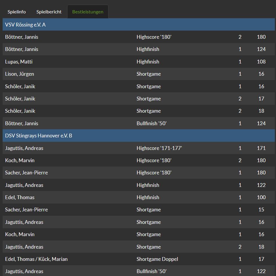 Nach furiosem Start (4:0 mit 12:0 Legs) musste das A-Team am Ende froh sein, noch einen Punkt im Rochen behalten zu dürfen. Lediglich Justin gelang ein 100er Highfinish gegen ein Gästeteam mit enormer Moral.
