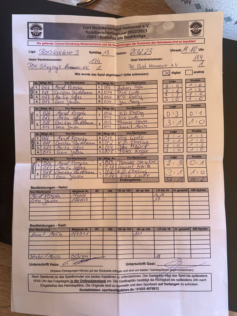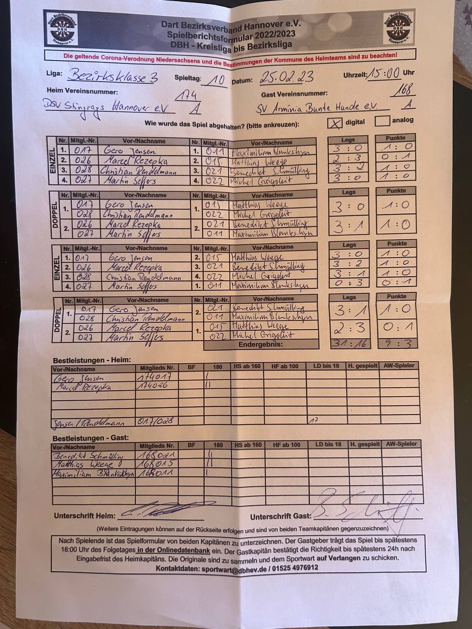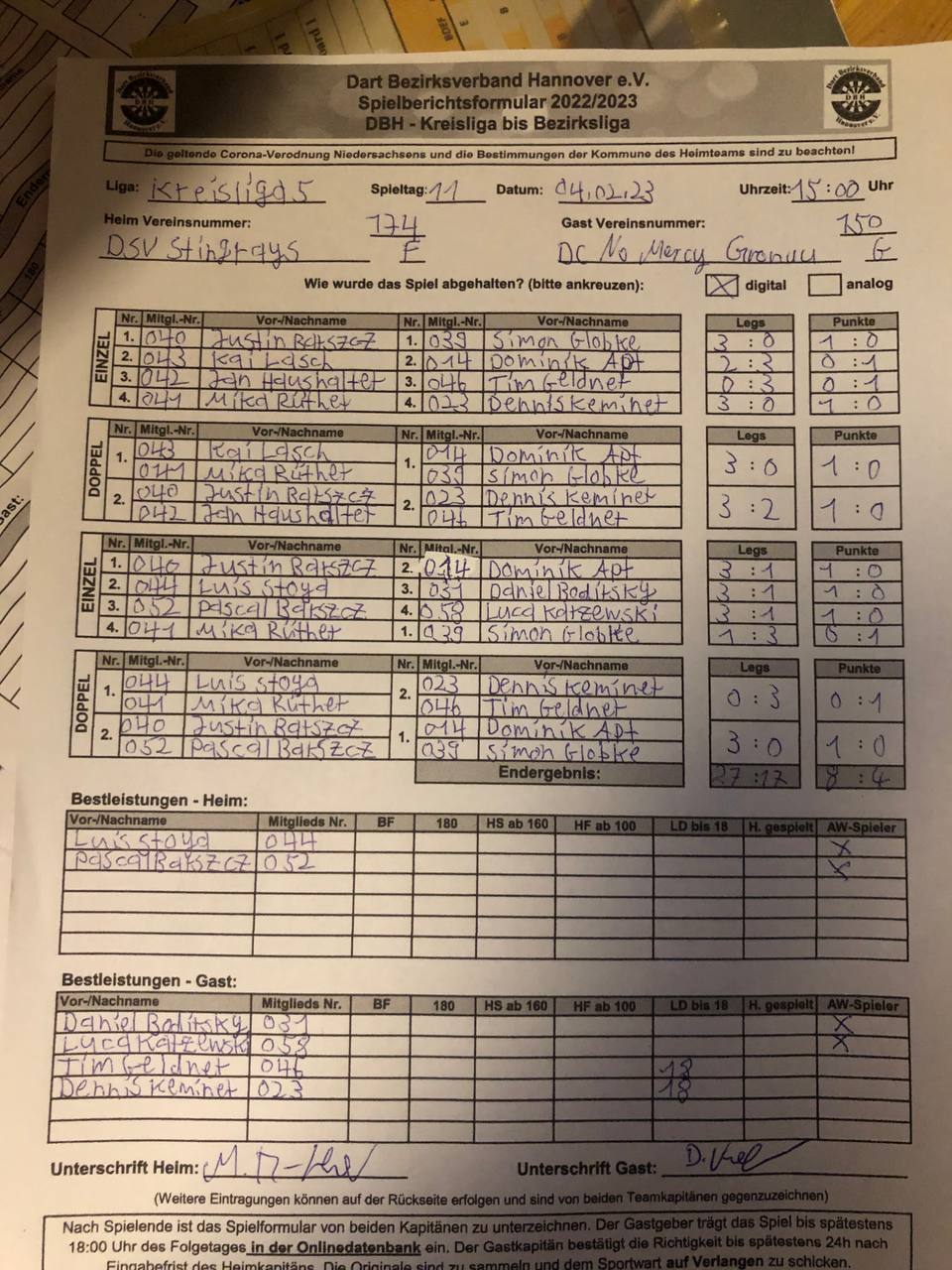 Herausragend auf Seiten der Gäste, der 12-Darter von Sören, der, wie man im Stream erfahren hat, erst seit einem halben Jahr im Verein spielt und vorher nur in der heimischen Garage tätig war. 😲Also, wer noch gute Darter sucht, einfach mal in die Garage der Nachbarn schauen.🎯
