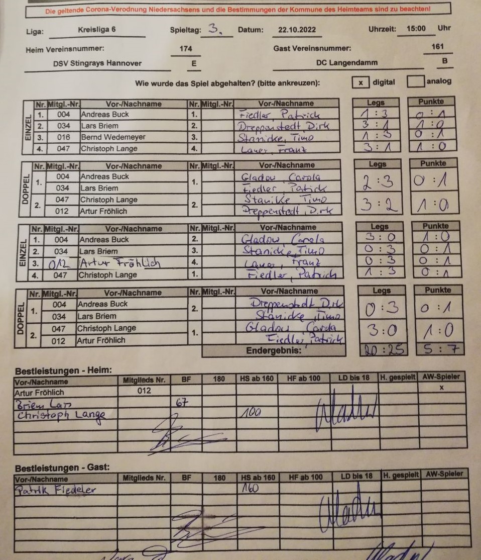 Zu keiner Zeit fanden die Rochen in ihr Spiel und so musste man den Heimweg aus Linden ohne Punkte und mit lediglich einer 180 von Thomas antreten. In der Tabelle geht der Blick, nach den zwei Niederlagen in Folge, jetzt erstmal nach unten.😮