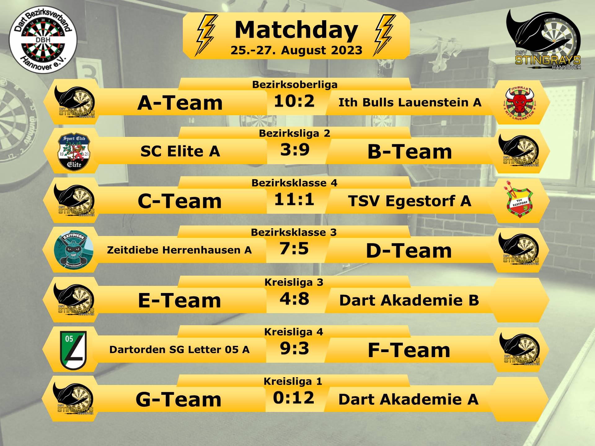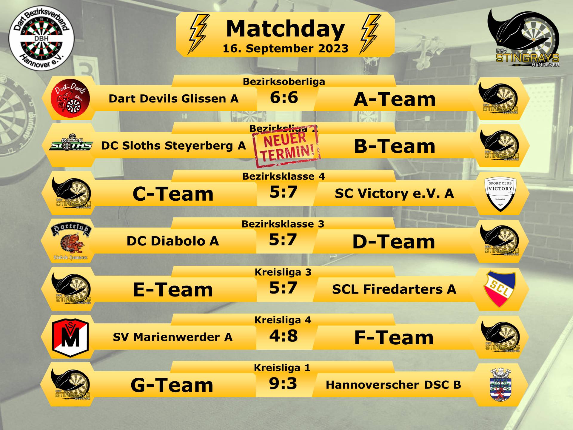 Spieltag 1 für unser G-Team, als erstes durften wir die haushohen Favoriten auf den Aufstieg im Rochen begrüßen, das A-Team der Dart-Akademie Hannover e.V..