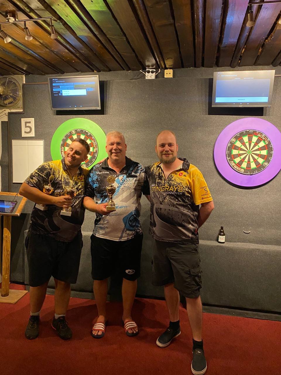 Ebenfalls ohne große Überraschungen verliefen die Spiele in Gruppe B, die der Seelzer Favorit Martin vor unserem „Korsar“ dominierte. Absolut ausgeglichen und knapp ging es dahinter zu, wobei unser „Eisbär“ Lars und Podbi-Pirat Kai Silber buchten, der „Keilerrochen“ Jan und Arne in den Bronze-Cup rutschten. Platz vier bis sechs trennten nur ein Leg.