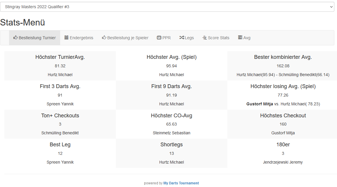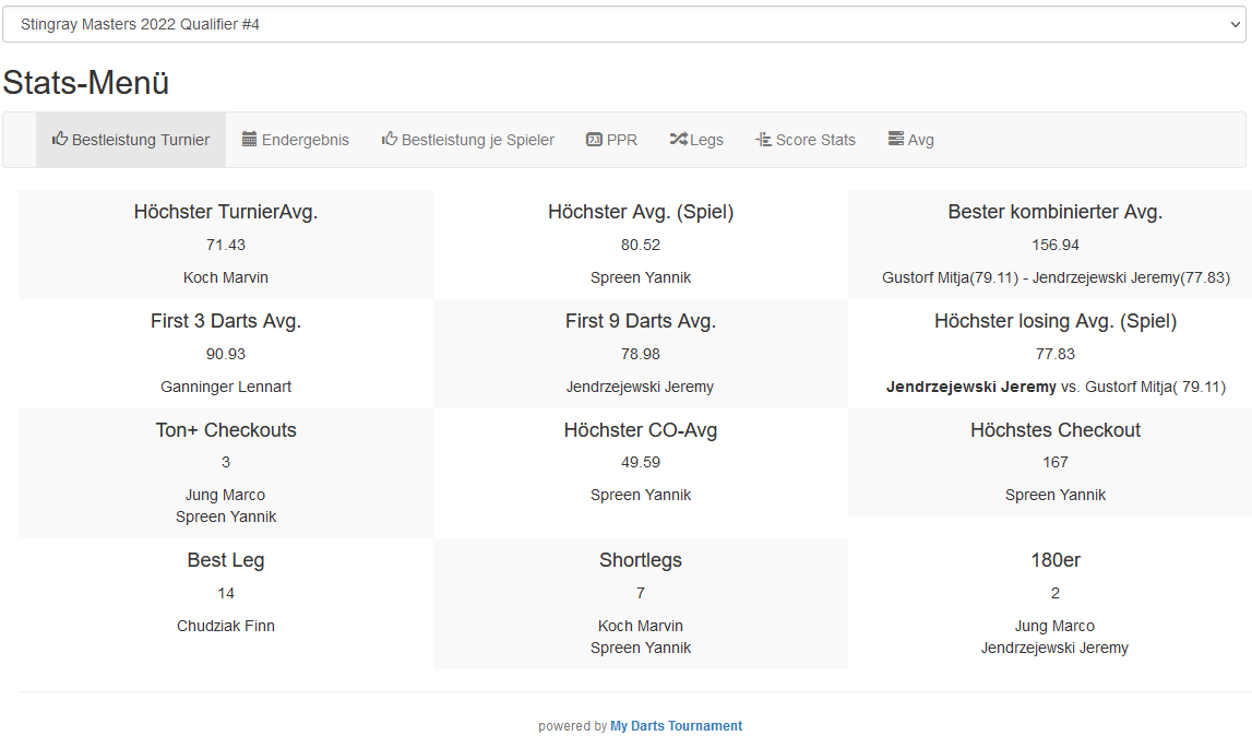 Das Turnier selbst war extrem hochklassig besetzt, was u.A. ein Gesamtaverage von 62 Punkten im Schnitt bezeugen dürften. 16 mal die 180, 13 mal ein gelöschtes Leg mit mehr als 100 Punkten und insgesamt 37 Low-Darts unterstreichen das nochmals deutlich!
