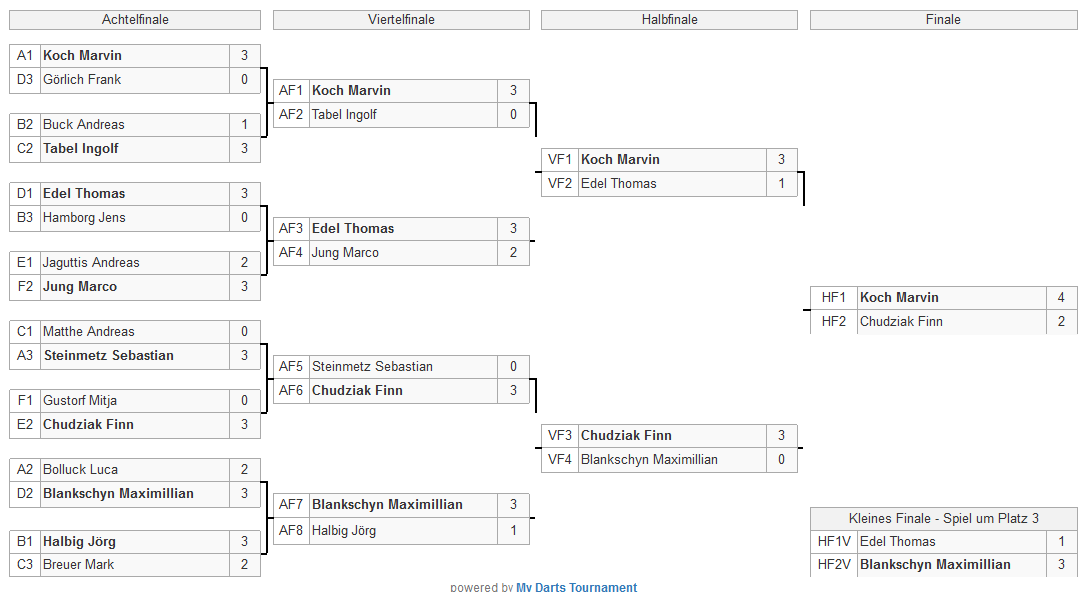 Bei allem gerechtfertigten Lob der Finalisten, gebührt den unterlegenen Halbfinalisten Thomas und Max ebenfalls höchste Anerkennung. Von Max darf man ein solches Ergebnis ja schon erwarten, er stand zuvor schon drei Mal auf dem Podium, und er gewann dann auch das kleine Finale mit 3:1. Thomas hat nun aber in drei Wochen auch schon das zweite Mal die Vorschlussrunde erreicht. Dabei ist sein wahrlich cooles Spiel gegen Marco Jung im Viertelfinale hervorzuheben, in das er als Underdog gestartet und das Thomas als Sieger beendet hat. In der Gruppenphase konnte er zudem Max in einem klasse Spiel noch ein 2:2 abringen.