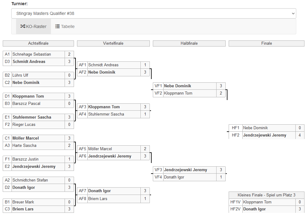 Dort gab es für die verbliebenen 7 Stingrays dann nicht mehr viel zu holen. Einzig unser Eisbär Lars Briem konnte sich 3:0 gegen Mark Breuer durchsetzen, musste eine Runde später dann aber gegen Igor klein beigeben. Jeremy holte sich sein Halbfinalticket durch ein 3:2 gegen Marcel Möller, Tom setzte sich gegen Sascha Stuhlemmer mit 3:1 durch. Dominik Nebe komplettierte das Halbfinale durch ein 3:1 gegen Andreas Schmidt.