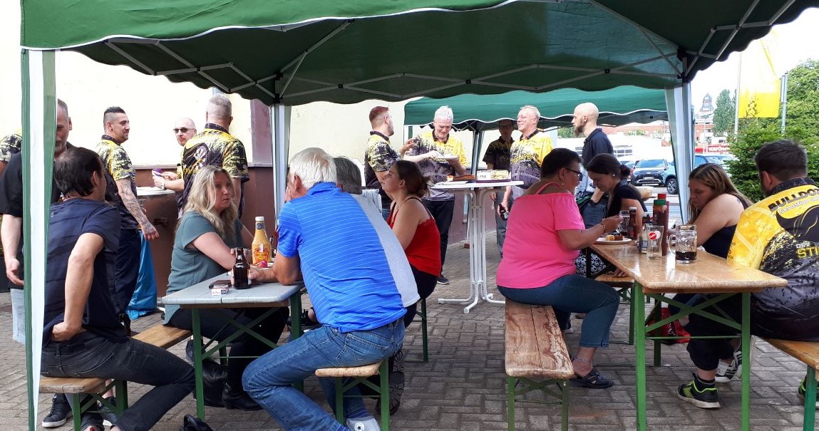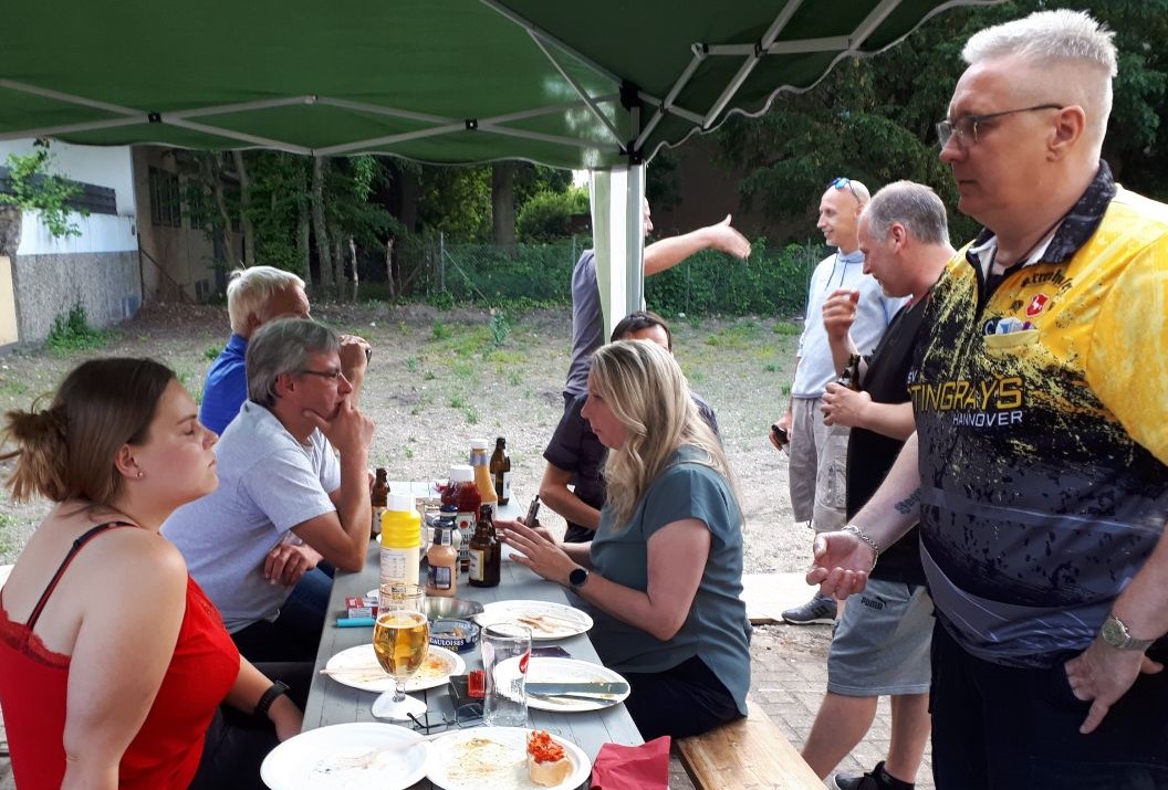 Nachdem im Verlaufe des Turniers ja immer mehr Spieler ausschieden, war irgendwann zu vermuten, dass am Ende nur noch einer übrig bleiben würde. Trotzdem sah man in ausschließlich zufriedene bis glückliche Gesichter, die ihre durch Niederlagen gewonnene Zeit intensiv miteinander am Tresen, am Grill, beim Bierpong, oder zusammen mit der zahlreich anwesenden Nachbarschaft, die im Vorfeld eingeladen war, in bierseeliger Stimmung verbrachten.