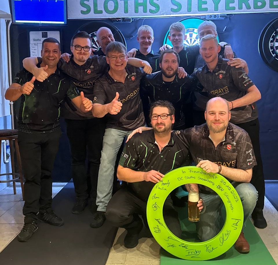 Der ebenso spannende, wie angenehme Abend mit groรartigen Gastgebern endete, wie es sich gehรถrt, mit einem Bierleg๐ป. Dieses wurde sichere Beute der Steyerberger, die mit den erschwerten Bedingungen (Heimteam mit 40gr Darts, Rochen mit 12,5gr Darts) deutlich besser zurecht kamen.
