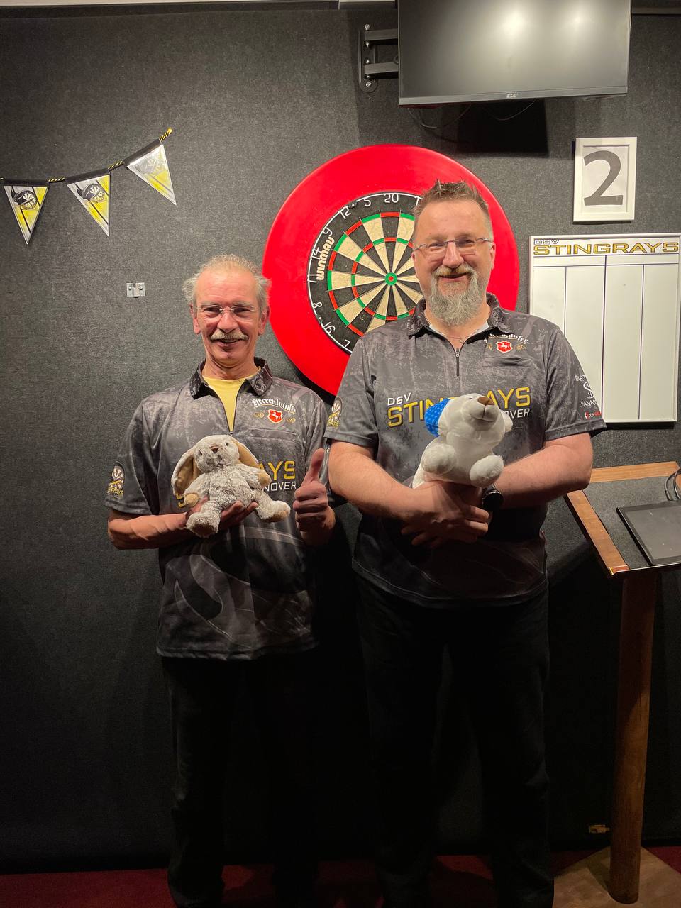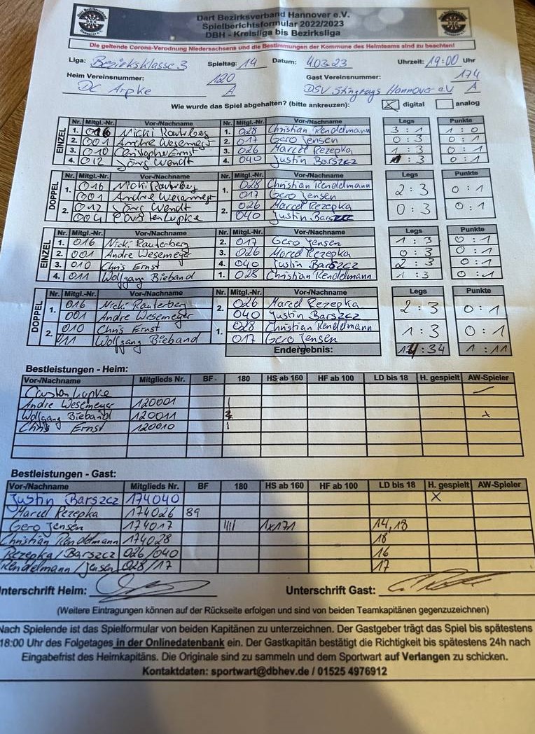 Das B-Team zeigte auch einen vernünftigen Auftritt und konnte gegen das A-Team des HDSC die Scharte aus dem Hinspiel auswetzen. 10:2 der Endstand, wobei Thomas eine 171 erzielte und Cäääpten⚓ "Korsar" Jens einen LD 15 inklusive 104er Highfinish ans Board zauberte.🙂
