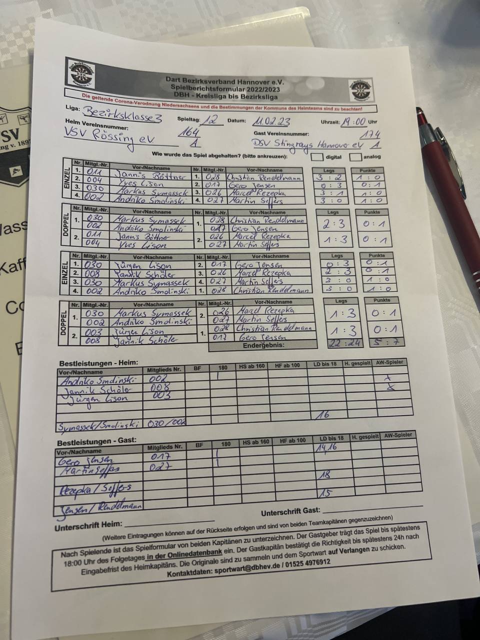 Herausragend auf Seiten der Gäste, der 12-Darter von Sören, der, wie man im Stream erfahren hat, erst seit einem halben Jahr im Verein spielt und vorher nur in der heimischen Garage tätig war. 😲Also, wer noch gute Darter sucht, einfach mal in die Garage der Nachbarn schauen.🎯