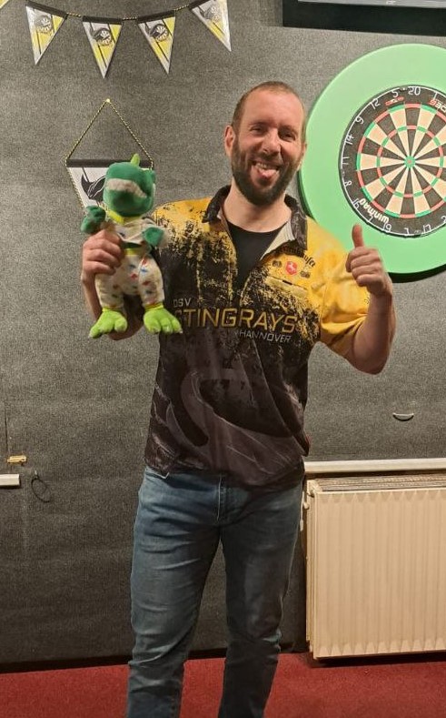 Ebenfalls bei den Shakespeare Dartists (E-Team) trat unser D-Team an. Es wurde ein zähes Spiel mit vielen Decidern, die aber zum Glück🍀 häufig auf Seiten der Rochen entschieden wurden. So nahm man den 8:4 Erfolg am Ende ebenso gern mit, wie Basti den Dino🦖 für den 7. Punkt.