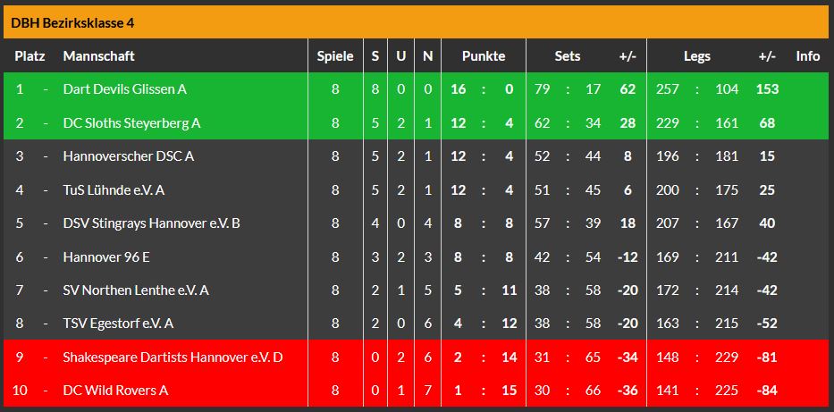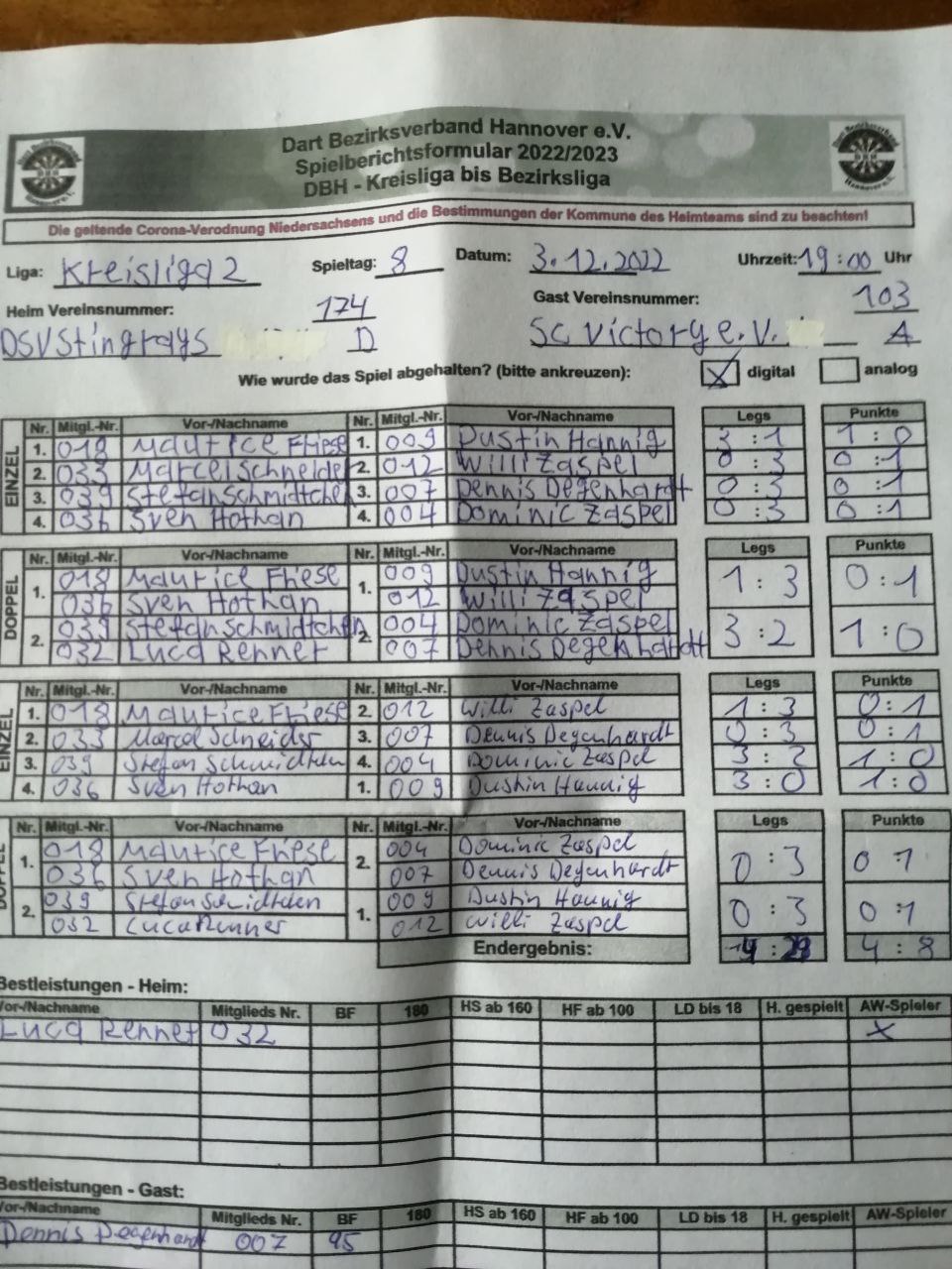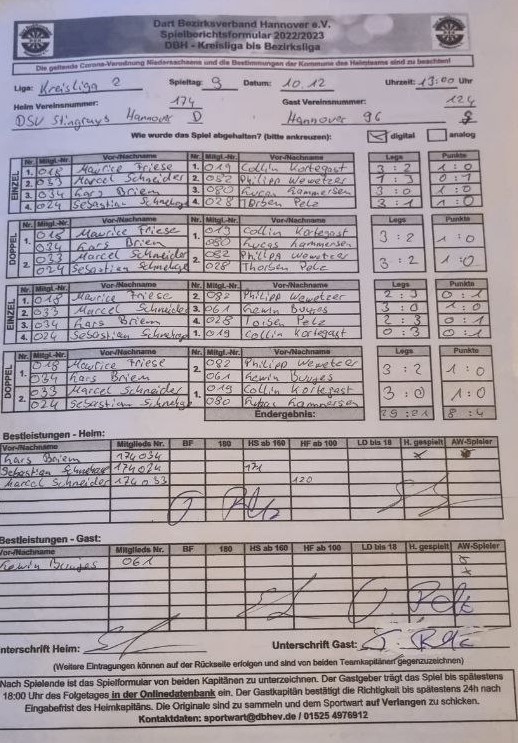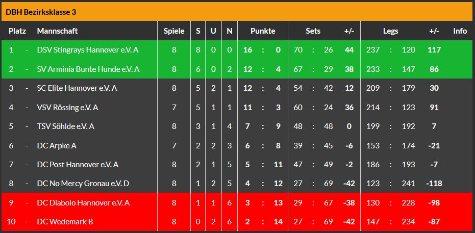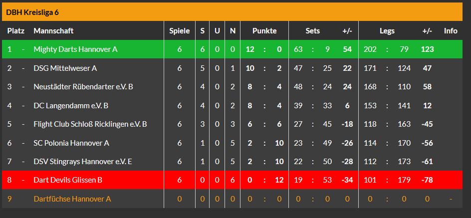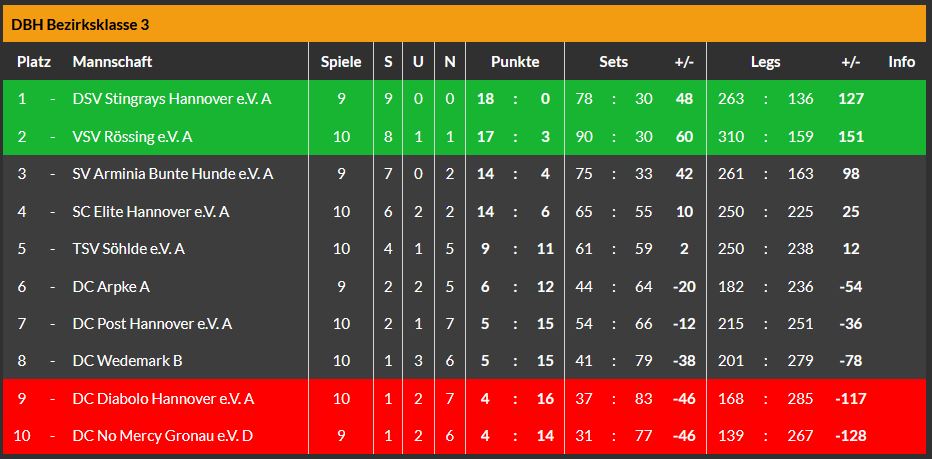 Parallel konnte das A-Team seine Aufgabe gegen DC Diabolo Hannover e.V. unaufgeregt erledigen. Am Ende stand ein glatter 11:1 Erfolg mit einigen Specials. Gero und Marcel spielten je 2 180er, Gero packte noch ein 17er dazu und Marcel ein 115er Highfinish.😮