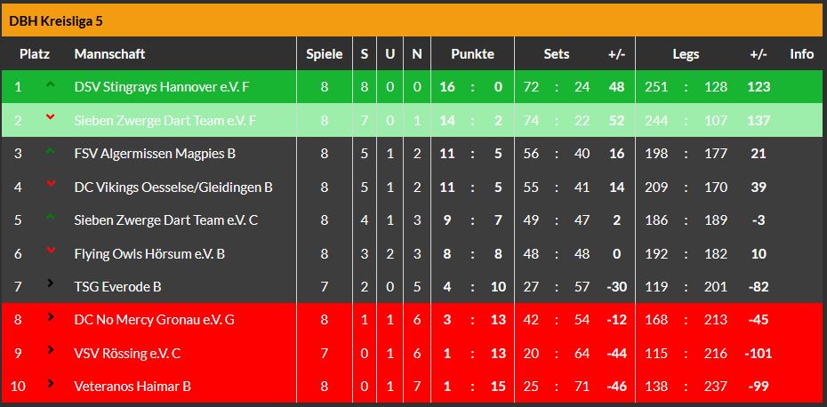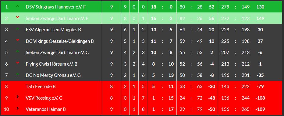 Den Herbstmeistertitel🥳 feierte das F-Team durch den 8:4 Erfolg gegen VSV Rössing Darts C. Der Ausfall einiger bisheriger Leistungsträger konnte gut verkraftet werden und so sprang die "zweite Garde" erfolgreich ein.👏 Das Alfelder Sieben Zwerge Team bleibt dem F-Team allerdings dicht auf den Fersen. Die Entscheidung in der Staffel 5 der Kreisliga wird wohl erst im Rückspiel der beiden Teams im nächsten Mai fallen.