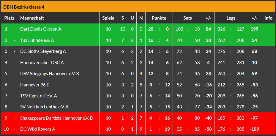 Das B-Team konnte den Abstand zum Tabellenkeller ausreichend vergrößern. Gegen die sympathischen Gäste vom TSV Egestorf Darts setzte man sich letztlich souverän mit 11:1 durch. Tzmarty mit einer 171 und Thomas mit einer 180.