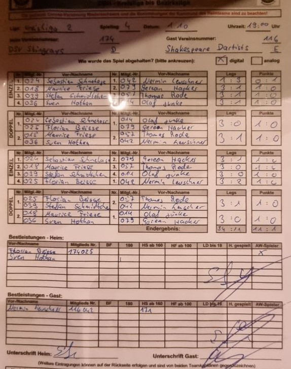 Zu keiner Zeit fanden die Rochen in ihr Spiel und so musste man den Heimweg aus Linden ohne Punkte und mit lediglich einer 180 von Thomas antreten. In der Tabelle geht der Blick, nach den zwei Niederlagen in Folge, jetzt erstmal nach unten.😮