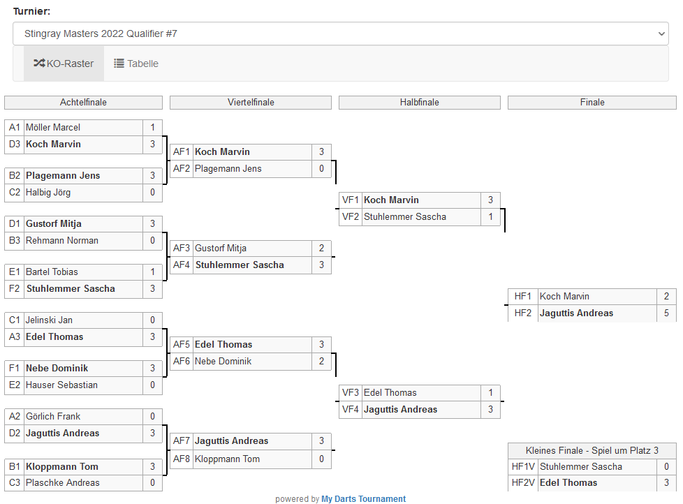 Im Halbfinale konnte sich das Geburtstagskind Marvin Koch gegen Sascha Stuhlemmer mit 3:1 durchsetzen und auch "Der Grieche" Andreas Jaguttis besiegte den letzten im Turnier verbliebenen Rochen Thomas Edel mit 3:1.