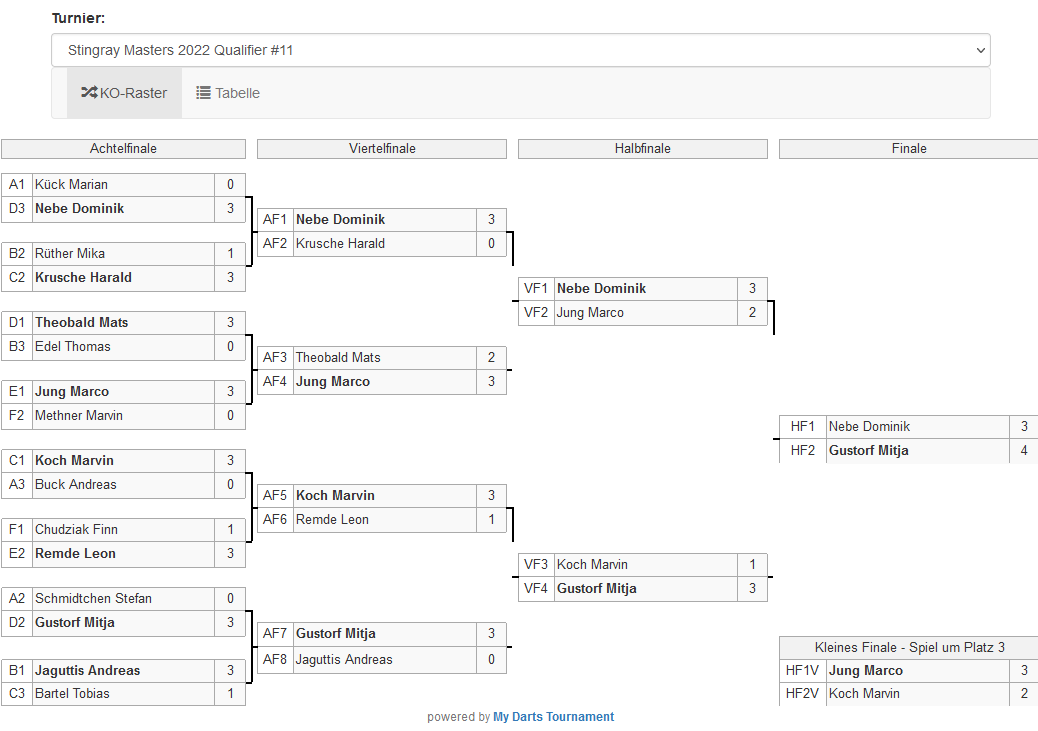 Nur Dominik Nebe konnte sich als einer der besten Dritten gegen den Gewinner der reinen Stingray-Vorrundengruppe Marian Kück durchsetzen und Leon Remde im teaminternen Duell gegen Finn Chudziak.