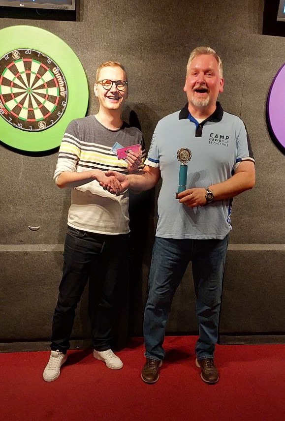 In der Runde der letzten acht gab es mit der Partie zwischen Jeremy Jendrzejewski und Igor Donath ein echtes Schmankerl😋 mit Averages um die 75 und dem glücklicheren Ende im Decider für Igor! Der konnte sich im folgenden Halbfinale auch gegen Michael Hurtz durchsetzen und traf somit im Endspiel auf Ralf Abelmann, der sich gegen Daniel Schnehage und Thore Kuhls seinen Weg ins Finale erkämpfte.💪