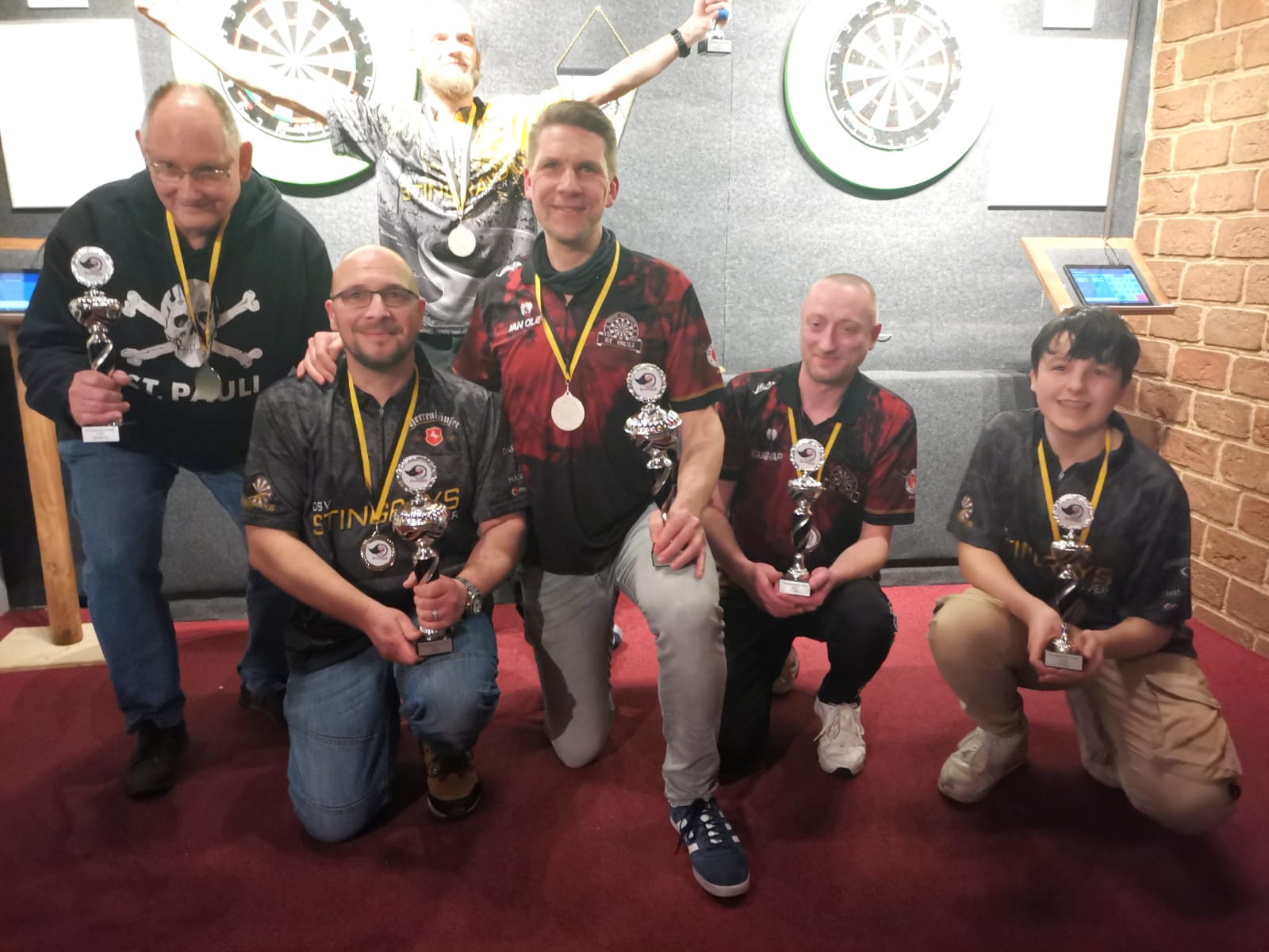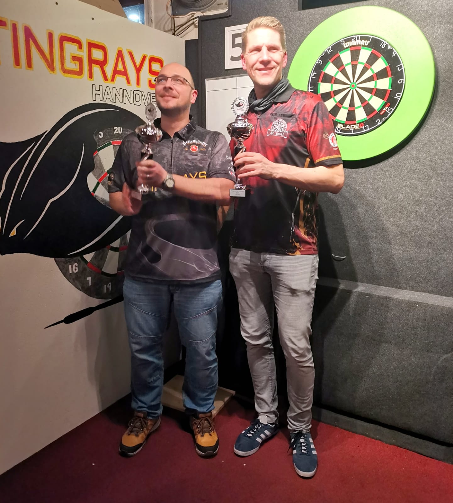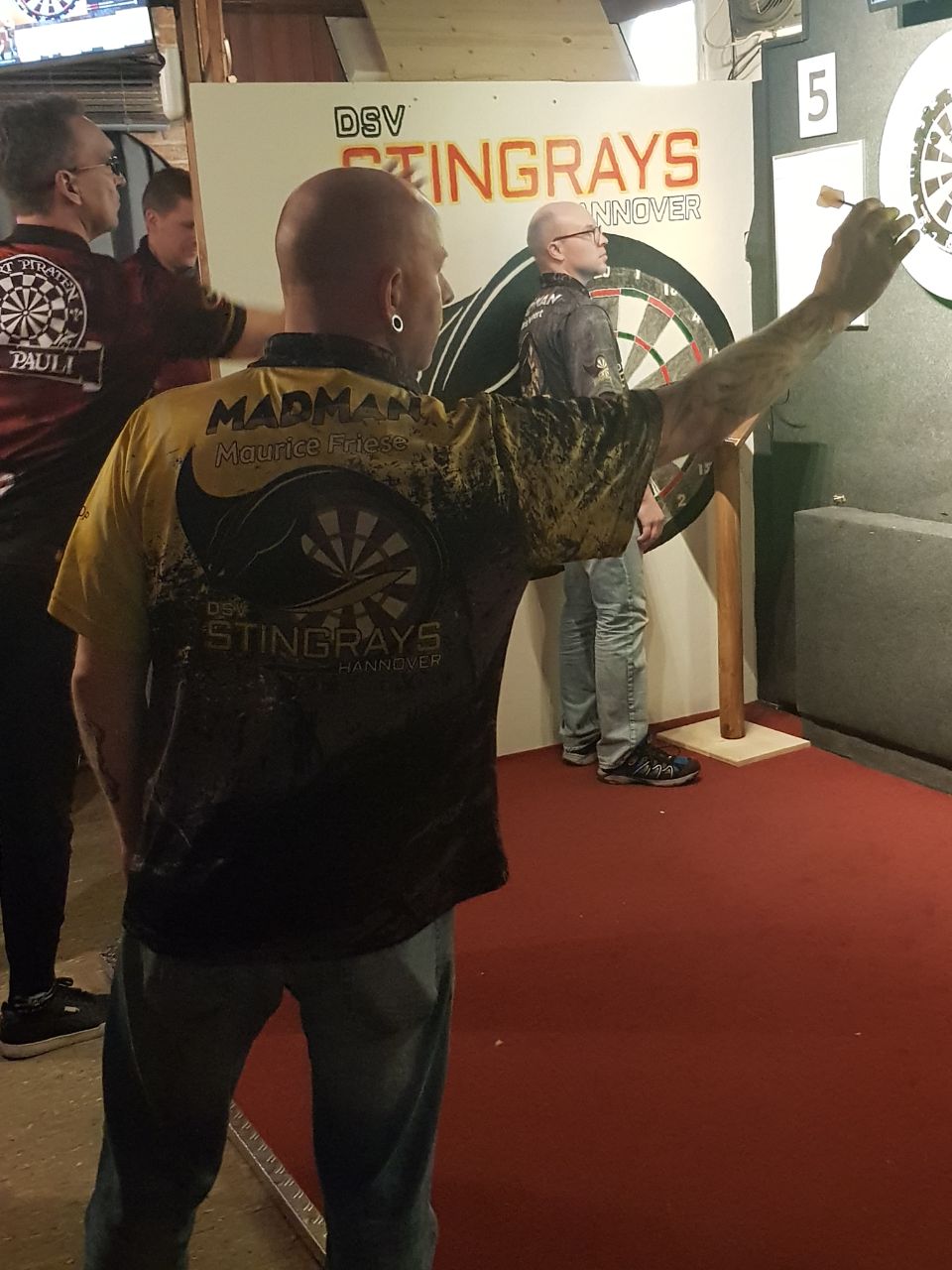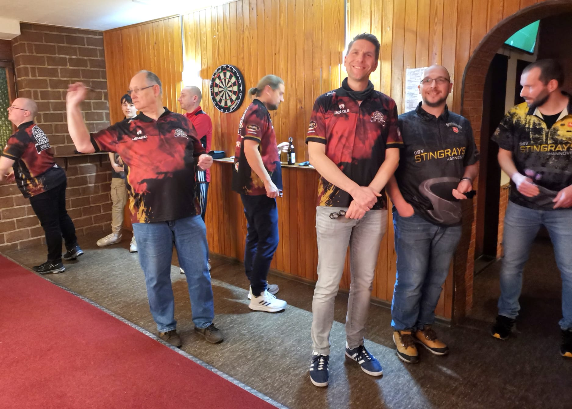 Die Anreise des Hamburger Autokorsos verlief reibungslos und überpünktlich konnten die Stingrays ihre Gäste begrüßen🤝. Die Chemie stimmte auf Anhieb und bei zwei parallelen Spielen im Viererteammodus stieg die Stimmung zunehmend. Beide Vereine besetzten beide Teams ohne Rücksicht auf sportliches Potential, der Weg war das Ziel. Umso schöner, dass niemand unter die Räder kam. Das Spiel zwischen Stingrays Team Eilenriede und den Dartpiraten B endete 6:6, die Stingrays Team Maschsee gaben sich nach vergebenen Matchdarts den Dartpiraten A mit 5:7 geschlagen. Über den Daumen also ein fast perfektes Warm-Up zu einem Two-Person-Turnier, deren Regeln die Teilnehmer zunächst überforderten.😮