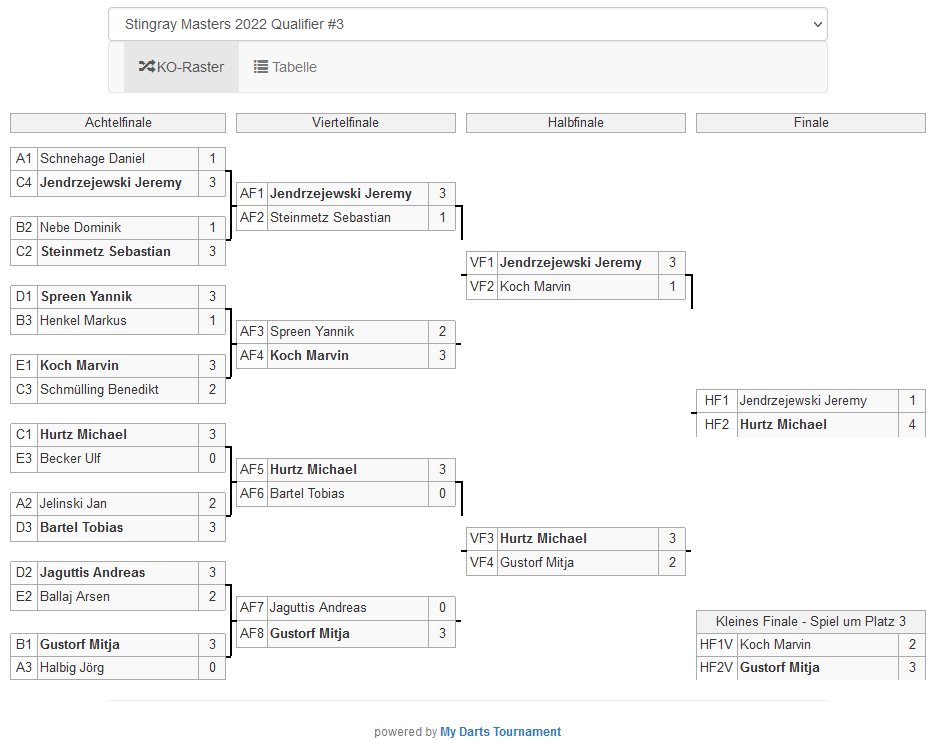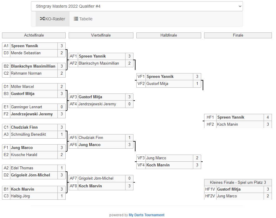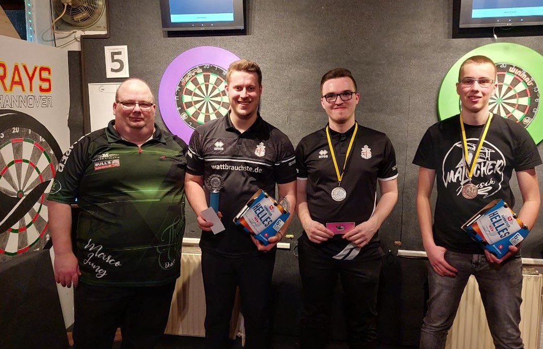 Im Spiel um Platz drei behielt Louis Fofana im Vereinsduell der Bascher Dartskulls gegen Mitja Gustorf mit 3:1 die Oberhand. Die Shakespeares Yannik Spreen und Sebastian Steinmetz, letzterer konnte letzte Woche noch den Finalsieg feiern, mussten sich im Viertelfinale Jeremy, bzw. Mitja geschlagen geben.