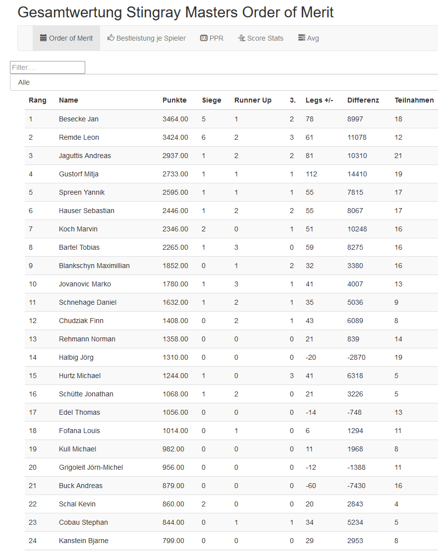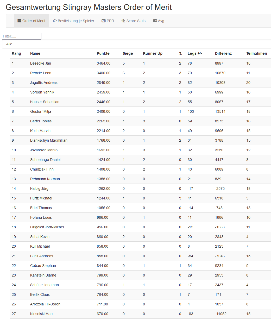 Die 30 Bestplatzierten der Order of Merit können sich jetzt unter Anmeldung Stingray Masters Finale für das Turnier am 12.12.201 12 Uhr einschreiben. Die 24 Bestplatzierten erhalten dann den ersehnten Platz. Die Liste wird unter https://stingrays.my-darts-tournament.de/mdt/ zeitnah veröffentlicht!