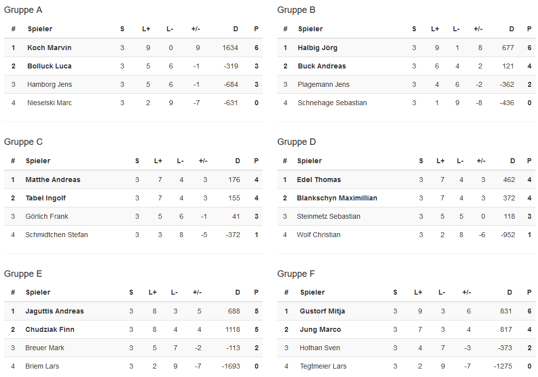 Dann ging es auch schon los und nach Beendigung der Vorrunde standen mit Marco Jung, Daniel Schnehage, Marko Jovanovic, Jonathan Schütte, Yannik Spreen und eben Mitja Gustorf bereits Spieler an der Spitze der Vorrundengruppen, denen man ausnahmslos auch den Turniersieg zutrauen konnte.