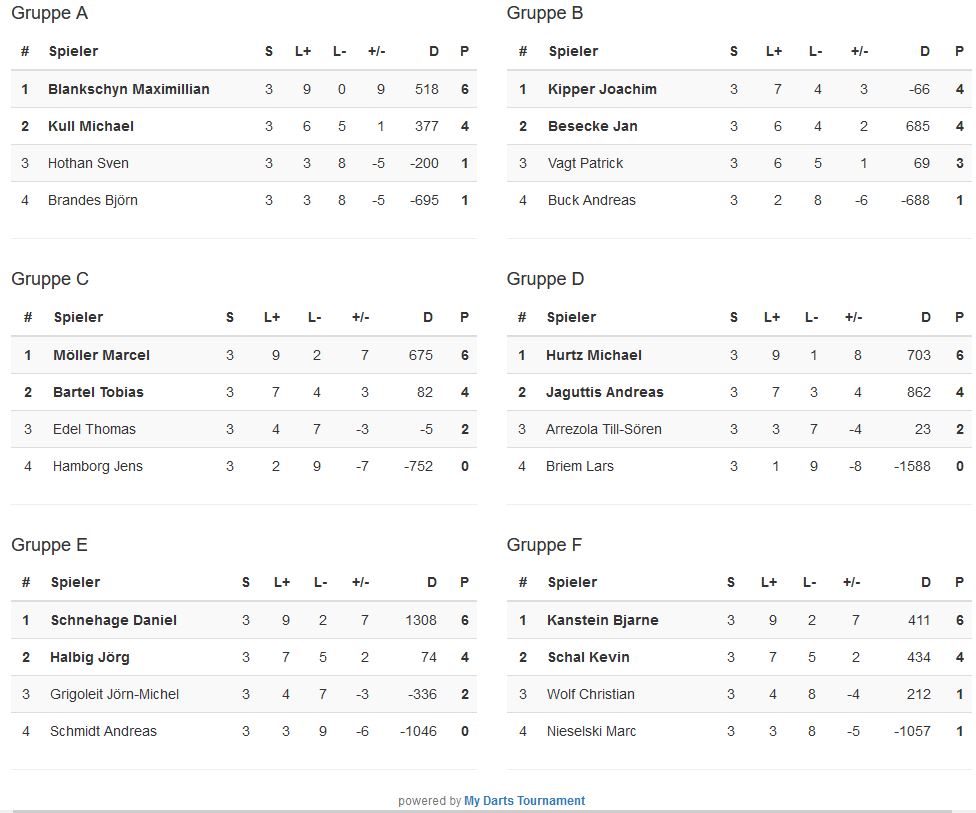 Am Ende der Gruppenphase standen gleich drei Rochen als Gruppenerste da. Bjarne, Tzmarty und Till standen jeweils als Gruppensieger fest. Mit Andreas Jaguttis und Marko Jovanovic gewannen außerdem zwei zugleich erfahrene, wie starke Dartspieler ihre Gruppen.
