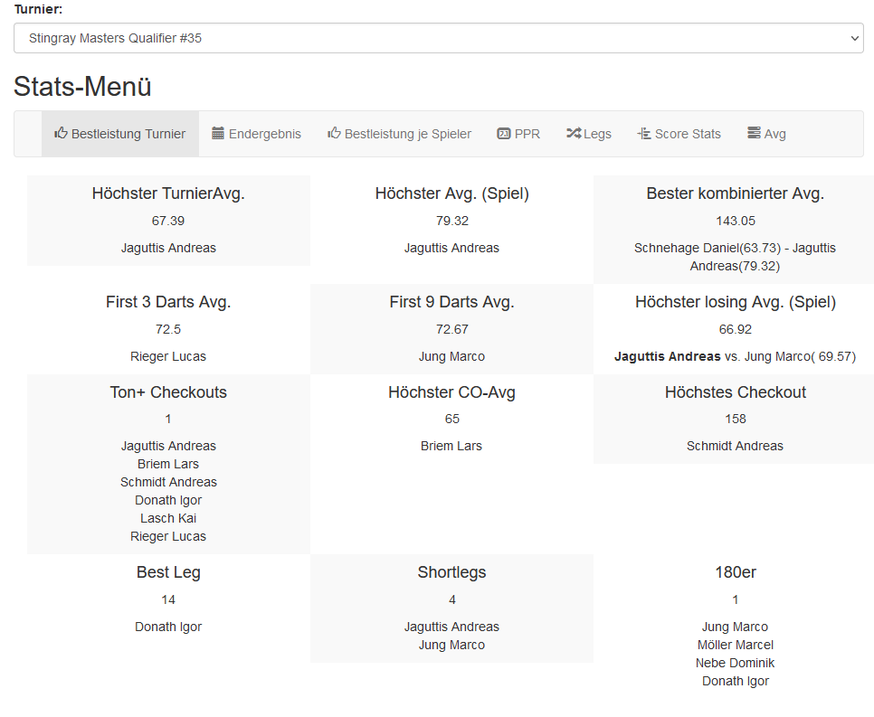 Überraschungen waren an diesem Tag eher Mangelware, nicht jedoch die zahlreichen Specials, an denen sich 14 Spieler beteiligten. 34 Shortlegs, neun davon allein durch Ralf, elf Highfinishes und 14 Highscores bezeugen wieder einmal die hohe Qualität unserer Turnierserie.