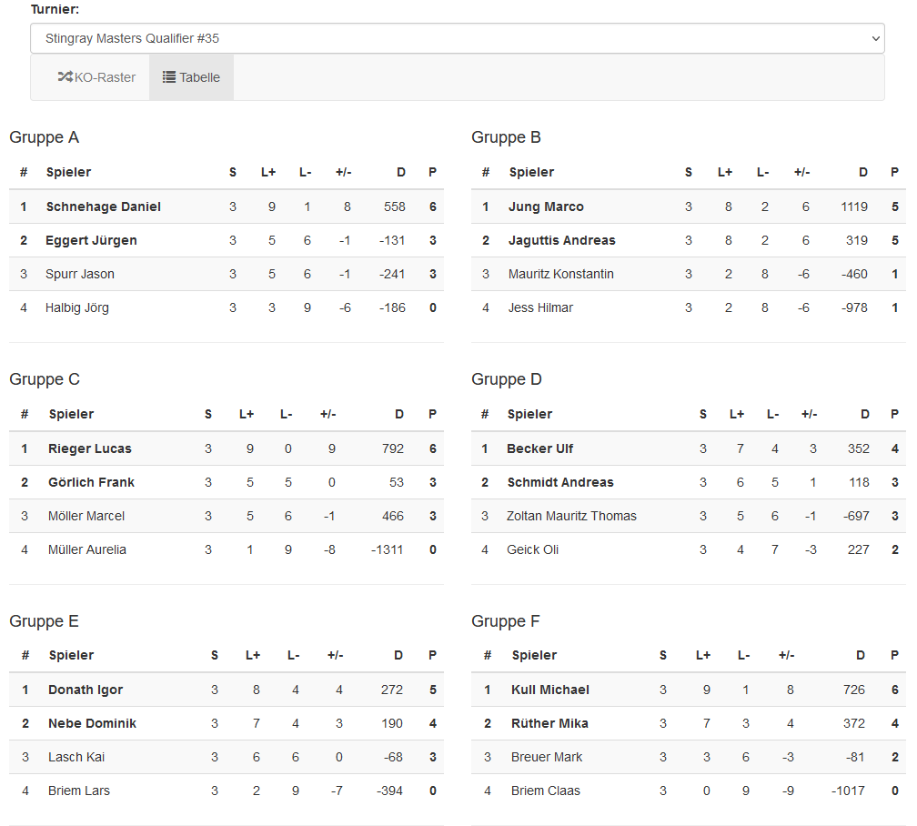 Die Gruppenphase zeigte aus Rochensicht einige interessante Konstellationen: in Gruppe A durfte sich der D-Teamkapitän Sebastian Schnehage mit seinem Co-Captain Stefan Schmidtchen herumschlagen (2:2), Christoph Lange musste in einer starken Gruppe Marcel Möller und Dominik Nebe den Vortritt lassen, Jan Haushalter hatte auch nicht mehr Glück in der Auslosung: in einer Gruppe mit den Igor, Tom und einem gut aufgelegten Andreas Schmidt gab es nicht viel zu machen. Auch Gruppe E war mit Sascha Stuhlemmer und unserem späteren Tagessieger Jeremy stark besetzt. Die Keiler Mika Rüther und Kai Lasch reihten sich tabellarisch dahinter ein. Justin Barszcz gewann dafür seine Gruppe F und ging als Gruppenerster in die KO-Runde.